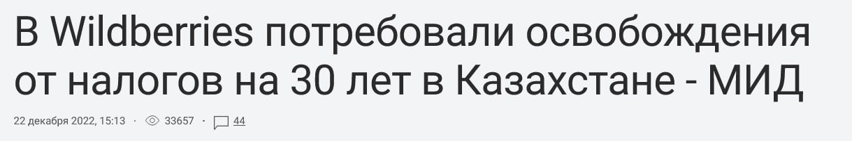 “Компания Wildberries - мы несколько лет с ними переговоры ведем на различных уровнях. Они высказывают различные мнения, но я вам скажу, на первых же переговорах Wildberries потребовал освобождения от налогов на 30 лет, а также помощь в строительстве ему складов. Естественно, мы не пошли на такие условия”, - сказал заместитель министра иностранных дел Алмас Айдаров на брифинге СЦК.
