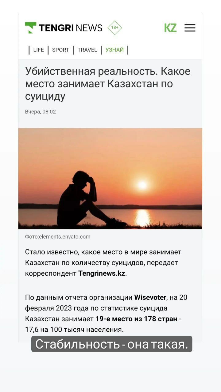 Стабильно высокое место занимает наша страна в этом рейтинге. Говорят, трепетные натуры нередко прибегают к подобному решению проблем, но, думаем, проблема всё же не в ранимой душе казахстанцев. Которое десятилетие власти Казахстана проводят т. н. рыночные реформы, что пошли в угоду горстке населения и легли бременем на остальных. Это самое бремя, неустроенность в жизни, неуверенность в завтрашнем дне, коррупция, выталкивают людей из окон и затягивают петли на шеях.