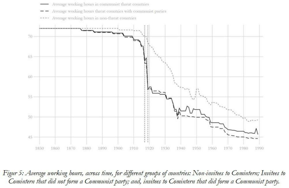 Разница с другими странами сохраняется до сих пор. Рабочая неделя в странах без коммунистов сокращалась гораздо медленнее и всё ещё не поравнялась со странами, где существуют сильные левые партии.
