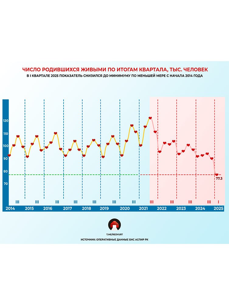 График №1 Рождаемость в Казахстане, показатель в первом квартале упал до минимума за последние 11 лет, снижение началось с 2021 года