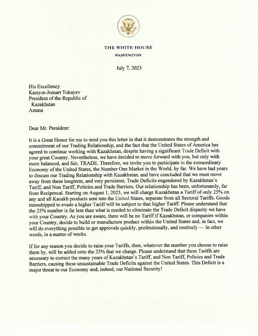 7 июля 2025 года Президенту Казахстана Касым-Жомарту Токаеву поступило письмо от президента США, в котором Вашингтон выразил “готовность к сотрудничеству”, но лишь после введения новых тарифов и экономических условий. Наши СМИ поспешили преподнести этот шаг как акт благородства, упирая на фразы вроде “Пожалуйста, поймите” и “Мы с нетерпением ждём сотрудничества с Вами”. В заголовках мелькали фразы о “дружбе”, “открытых перспективах” и “сдержанном тоне американской дипломатии”. Белый господин был вежлив!